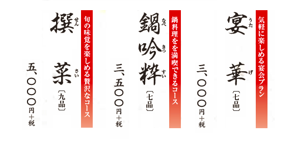 [ 前菜・造り・揚物・蒸物・粋品・焼物・食事・甘味 ]