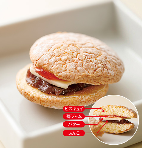 加賀フルーツランドの苺を使ったジャムとつば屋のあんことバターのコラボ。ボリュームたっぷりなのにペロリと食べられるブッセです。背徳感を味わえる魅惑のデザート。