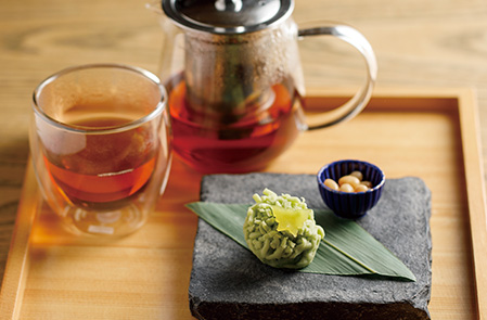 加賀藩と同じ時を刻む東山の老舗茶舗『天野茶店』が代々継承する加賀棒茶「加賀かおり」をチョイス。前田家と共に尾張から金沢に来たという400年以上の歴史ある茶舗です。地元で愛される加賀棒茶は、令和の大嘗祭でも献上された、新茶の葉脈の根の部分を煎じた香り高いお茶。数ある茶舗でもその店によって煎じ方が異なるのが特徴です。抹茶も数ある種類の中から厳選。茶道が盛んな金沢らしく甘いお菓子とのマリアージュは抜群です。